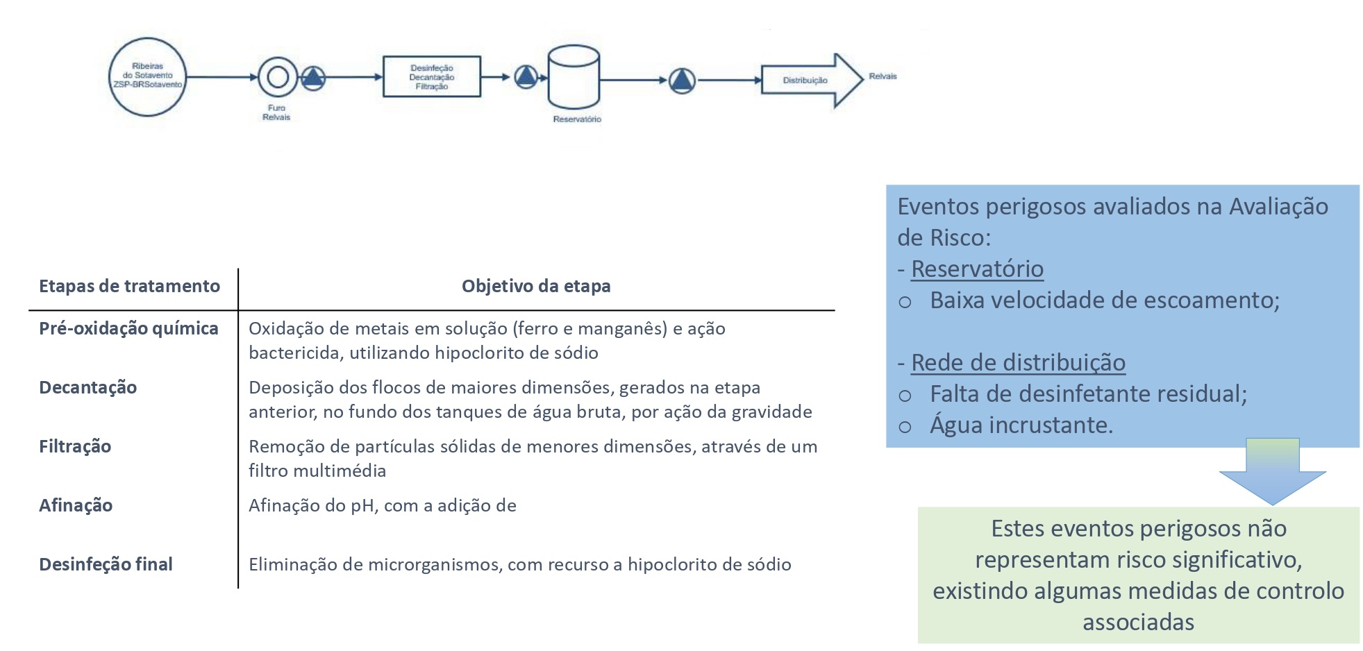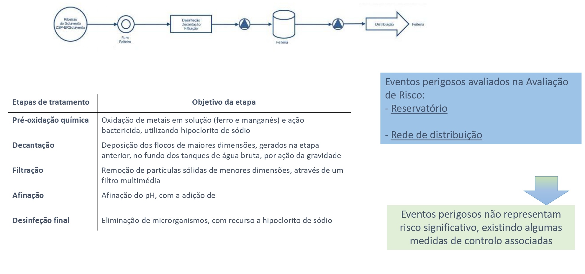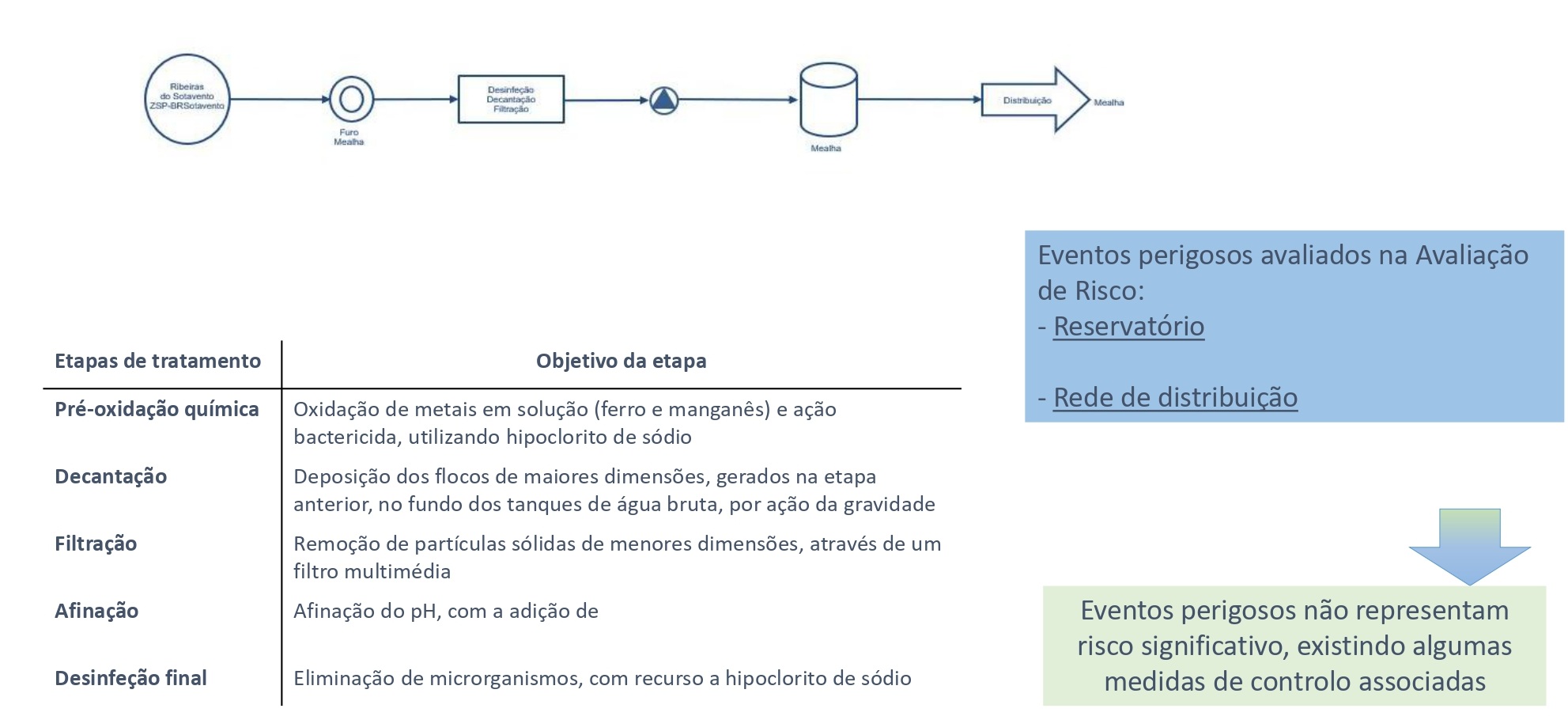 No Sistema Municipal de águas de abastecimento público de Tavira existem 6 Zonas de Abastecimento (ZA), com diferentes origens de água (superficial e subterrânea). Abaixo são enumeradas as várias etapas de tratamento existentes para cada ZA, com a descrição dos seus objetivos, bem como uma breve descrição de quais os eventos perigosos considerados na avaliação do risco.